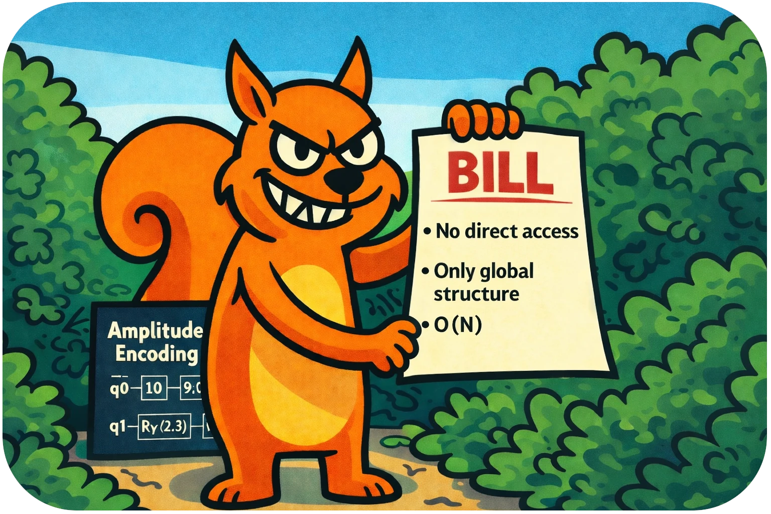 Amplitude encoding seems powerful, but it comes with fixed upfront costs and a major limitation: once your data is stored in amplitudes, you can no longer check it entry by entry. See what you lose, what you gain, and why only a small group of algorithms can actually benefit from it.